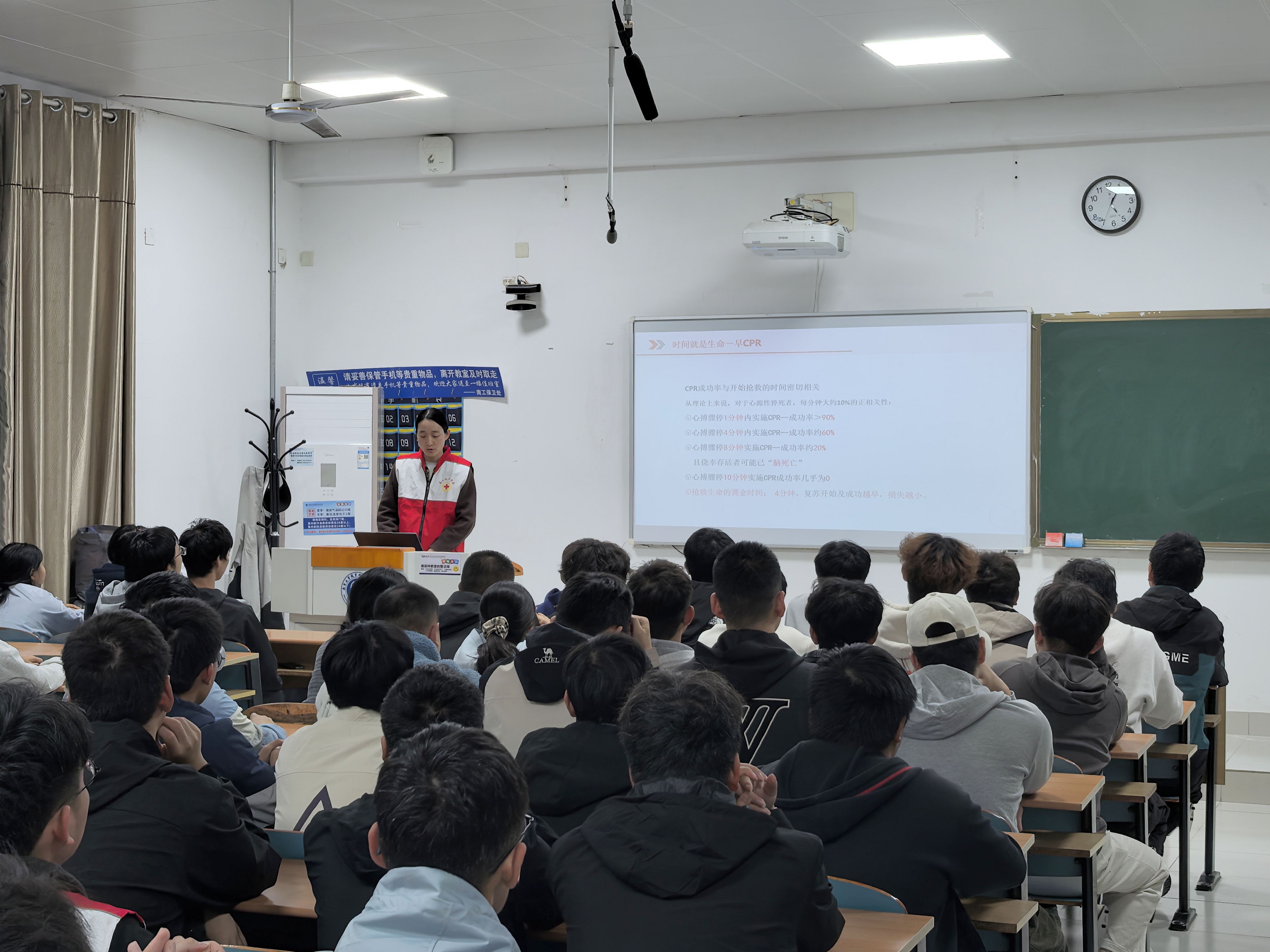 培训中,仇洪红以她专业而不失生动的语言,系统讲解了心肺复苏(CPR)的操作流程、自动体外除颤器(AED)的使用原理以及气道异物梗阻现场施救方法等内容。她特别结合校园生活中可能遇到的一些突发状况,深入浅出地分析了“黄金救援4分钟”的重要性,并逐一演示了胸外按压、开放气道、人工呼吸等关键步骤的操作要点,强调了科学施救与自我保护在应急中的必要性。