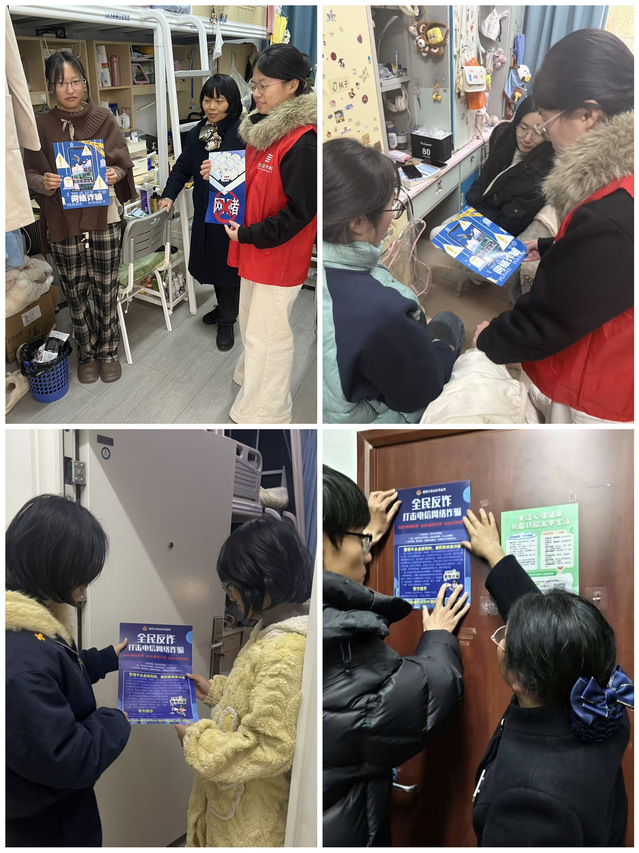 另一方面,学院组织公寓宿管员、楼层长、学生干部骨干及志愿者成立宣讲小队,携带海报及反诈宣传资料,深入各学生宿舍开展“面对面”的微宣讲。宣讲队员们结合海报内容,向同学们详细解析网络刷单、冒充客服、虚假贷款、交友投资等在校内高发的诈骗类型,揭露其作案手法与话术套路,并指导同学们安装使用“国家反诈中心”APP,提醒大家时刻保持警惕,保护好个人财产安全。