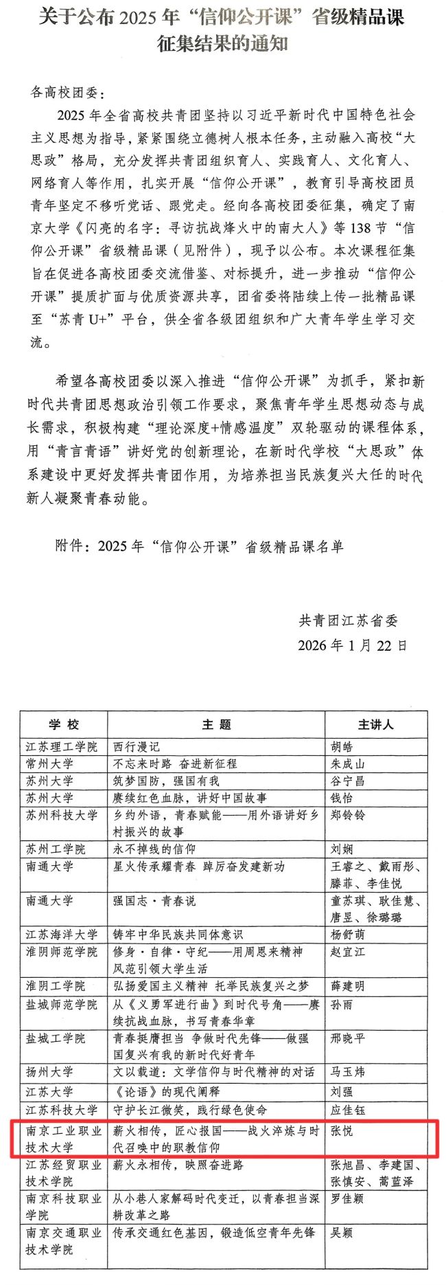 近日,共青团江苏省委正式发布了《关于公布2025年“信仰公开课”省级精品课征集结果的通知》,经高校推荐、团省委评选,在全省范围内共评选出138门“信仰公开课”入选“省级精品课”,由白菜官网团委和电子信息工程学院/集成电路学院选送的《薪火相传,匠心报国——战火淬炼与时代召唤中的职教信仰》成功获评“省级精品课”。