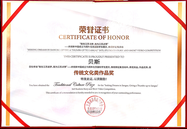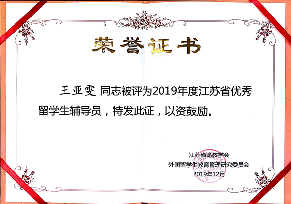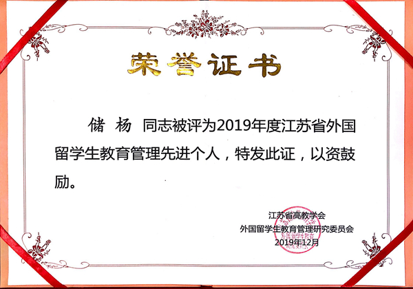 会上,江苏省高等教育学会外国留学生教育管理研究委员会副理事长俞晓南宣读了表彰决定。白菜官网国际教育学院储杨老师获得“江苏省外国留学生教育管理先进个人”称号,王亚雯老师获得“江苏省优秀留学生辅导员”称号,贝斯同学获得“我在江苏追梦,我为江苏点赞”——庆祝新中国成立70周年在苏国际学生图文、微视频征集活动“传统文化类作品奖”。