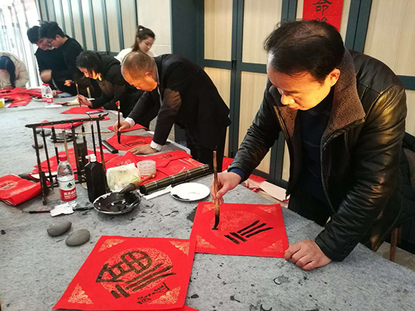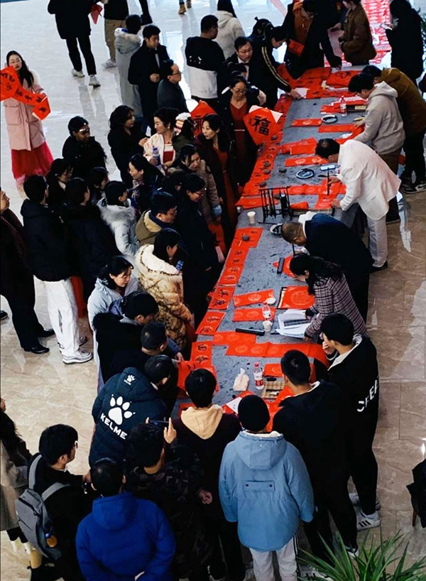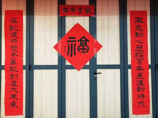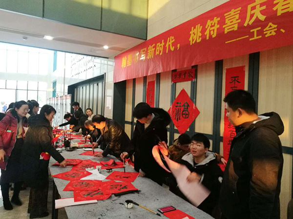 值此2020新年到来之际。南工院举行了辞旧迎新大联欢。工会,艺术设计学院,校书法协会联合举办了以“翰墨书写新时代,桃符喜庆春满园”为主题的送春联送福字活动。活动启动仪式由(全国)教育书画协会高等书法教育分会理事、校党委委员、纪委书记于林惠教授提笔书写“福字”开始,接着由(全国)教育书画协会高等书法教育分会会员、书法协会指导老师刘圣进书写自撰对联:不忘初心历经百年迈进新时代,牢记使命双手万能创造大未来。然后广大师生一起挥毫,数千师生积极参与。近年来,白菜官网书法艺术在三全育人,立德树人,增进学校文化氛围,提升师生文化自信等方面做了一些尝试,为学校文化育人作出了积极的贡献。通过这次活动,锻炼了书法协会同学们的动手能力,加强了广大师生员工的情感交流,也表达了书法协会新年深情的祝福:祝福祖国繁荣昌盛、人民幸福安康!祝福学校蒸蒸日上,又上新台阶!祝福全校师生新年快乐,万事顺意!