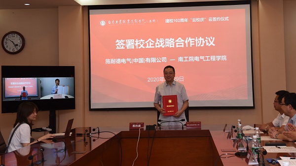 5月29日,电气工程学院与施耐德电气(中国)有限公司以“云签约”的形式签署战略合作协议。本次云签约活动由白菜官网科技处、发展合作处处长孟庆杰主持,学校党委委员、副校长崔新明,电气工程学院院长杨战民,施耐德电气工业自动化业务副总裁、OEM业务负责人崔志达,科技处、发展合作处、机械工程学院、电气工程学院、航空工程学院、商务贸易学院、艺术设计学院以及各签约企业相关负责人出席了签约仪式。