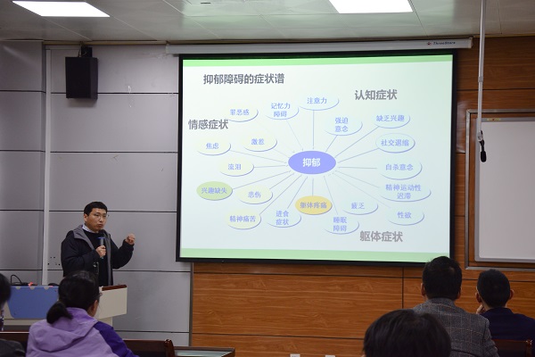 4月14日,经济管理学院邀请南京医科大学附属脑科医院医学心理科滕昌军医生在乐业楼314教室作了一场主题为“大学生心理问题之焦虑、抑郁的识别和应对”的专题培训讲座。经济管理学院党总支书记陈林杰、党总支副书记黄滢、全体班主任、辅导员共50余名教师以及30名学生代表参加了本次会议。黄滢副书记主持了本次会议。