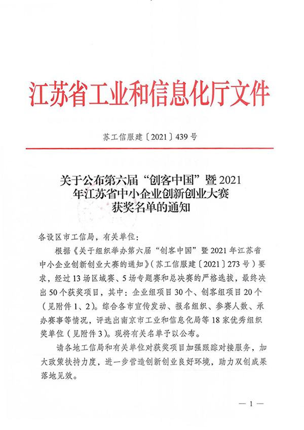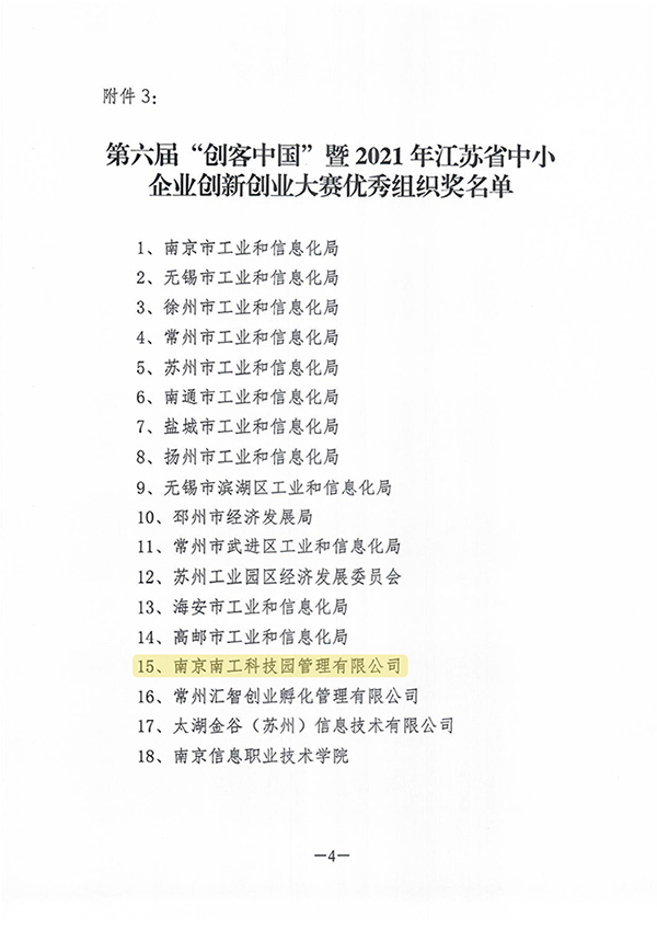 近日,第六届“创客中国”暨2021年江苏省中小企业创新创业大赛顺利落下帷幕,江苏省工业和信息化厅综合各市宣传发动、报名组织、参赛人数、承办赛事等情况,评选了大赛优秀组织奖,白菜官网大学科技园运营公司——南京南工科技园管理有限公司名列其中。