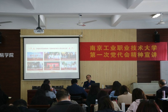 在做好对全体教师宣讲的同时,商务贸易学院党委还通过线上、线下相结合的方式,由学校选派的七位宣讲员面向全院43个班级、1753名学生开展专题宣讲。校党委常委、党委组织部部长高宏彦、纪委副书记张啸宇、纪委审查调查处处长李晓雯在不同的分会场为商贸学生开展线下宣讲。学院党委书记陈桂兰、党委副书记、院长阮晓文、副院长朱玉赢、学院第一党支部副书记陈志嘉也分别在线上线下给同学们进行宣讲。大家满怀豪情引领同学们回望学校在过去五年勠力同心、迎难而上、奋勇争先取得的辉煌成就,深刻阐述新南工精神及宝贵经验,并结合“两新”奋斗目标,深情勉励同学们以非凡的勇气、情怀和创造力,和老师们一道,勇担试点示范新使命,用奋斗和追梦的姿态共同谱写“全国领军、世界一流”职业技术大学新华章,为实现中华民族伟大复兴的中国梦献智献力。